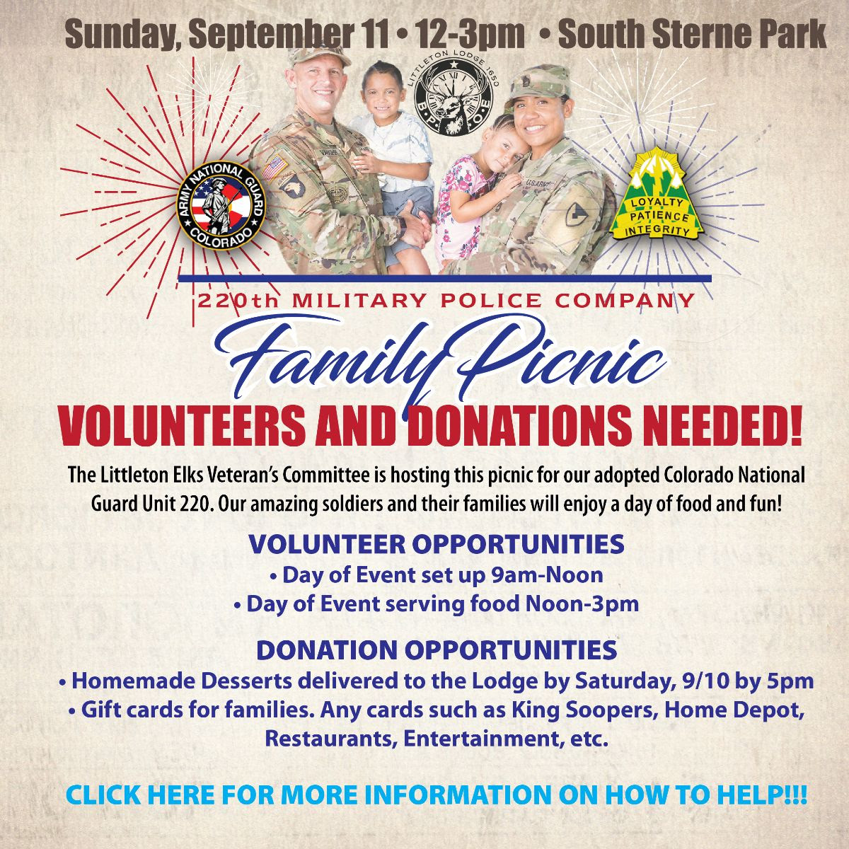 Colorado National Guard Picnic – NEED VOLUNTEERS – see attached Colorado National Guard Picnic – NEED VOLUNTEERS – see attached Calendar Add to Calendar Add to Timely Calendar Add to Google Add to Outlook Add to Apple Calendar Add to other calendar Export to XML When: September 11, 2022 @ 12:00 pm – 3:00 pm America/Denver Timezone 2022-09-11T12:00:00-06:00 2022-09-11T15:00:00-06:00