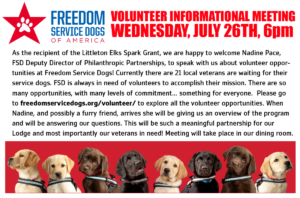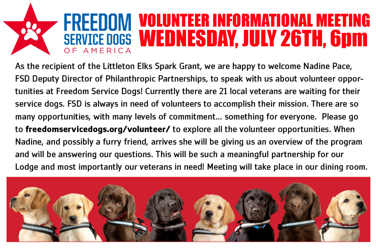 Freedom Service Dogs of America Info Meeting Freedom Service Dogs of America Info Meeting Calendar Add to Calendar Add to Timely Calendar Add to Google Add to Outlook Add to Apple Calendar Add to other calendar Export to XML When: July 26, 2023 @ 6:00 pm – 7:00 pm America/Denver Timezone 2023-07-26T18:00:00-06:00 2023-07-26T19:00:00-06:00