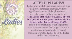 Ladies of the Elks Ladies Night Ladies of the Elks Ladies Night Calendar Add to Calendar Add to Timely Calendar Add to Google Add to Outlook Add to Apple Calendar Add to other calendar Export to XML When: April 3, 2023 @ 6:00 pm – 8:30 pm America/Denver Timezone 2023-04-03T18:00:00-06:00 2023-04-03T20:30:00-06:00