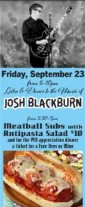 Meatball Sub Dinner with Dancing to Josh Blackburn Meatball Sub Dinner with Dancing to Josh Blackburn Calendar Add to Calendar Add to Timely Calendar Add to Google Add to Outlook Add to Apple Calendar Add to other calendar Export to XML When: September 23, 2022 @ 5:30 pm – 11:00 pm America/Denver Timezone 2022-09-23T17:30:00-06:00 2022-09-23T23:00:00-06:00